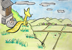 ほんとうにのどかな田園風景です。狐に貰った赤ん坊の中でもとても好きな絵の一つです。自分も城山狐になったつもりになってのんびりと柿でもほおばりながら眺めてみたいですね。遠く眼下には、干潟や今隈その向こうに孫次郎の「櫨の宿場町」だった松崎が見えたことでしょう。だんぼでは野良仕事のお百姓さんも見えます。今は農業も厳しく大変ですが田園風景は守られています。おけんぞくさんの田の神さんが守ってくれているのかもしれませんね。