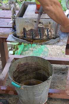 煮出した袋詰めの櫨の実を手製油圧ジャッキを利用した